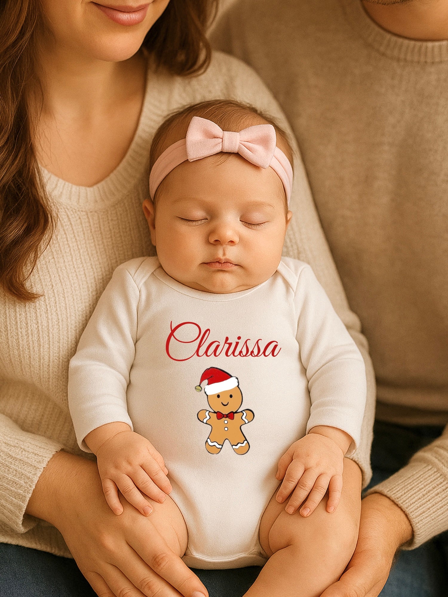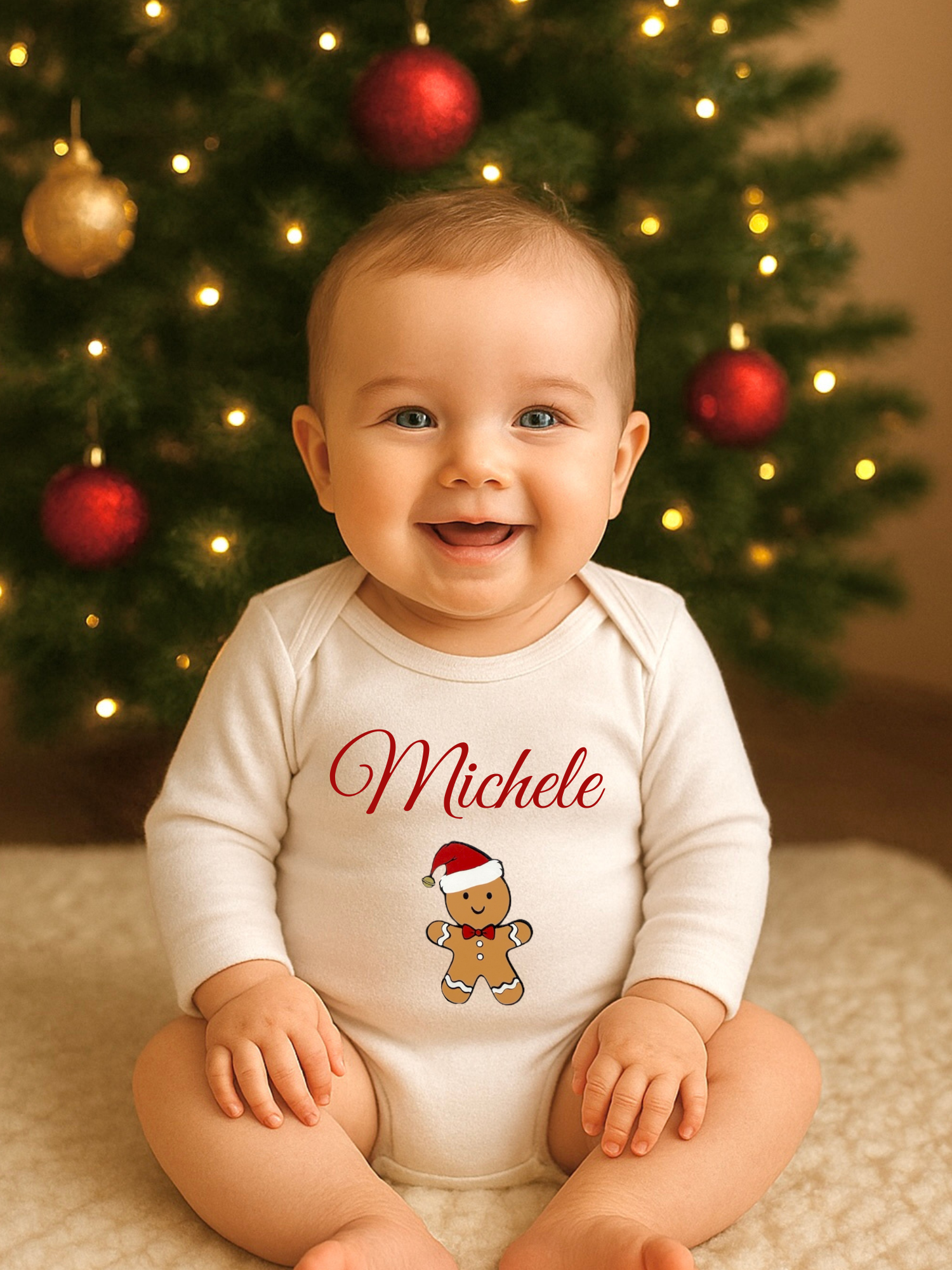 La dolce illustrazione del simpatico omino di pan di zenzero aggiunge un tocco di allegria e calore, mentre la personalizzazione con il nome lo rende un capo unico e speciale — perfetto anche come regalo per il primo Natale o per scattare foto ricche di dolcezza.