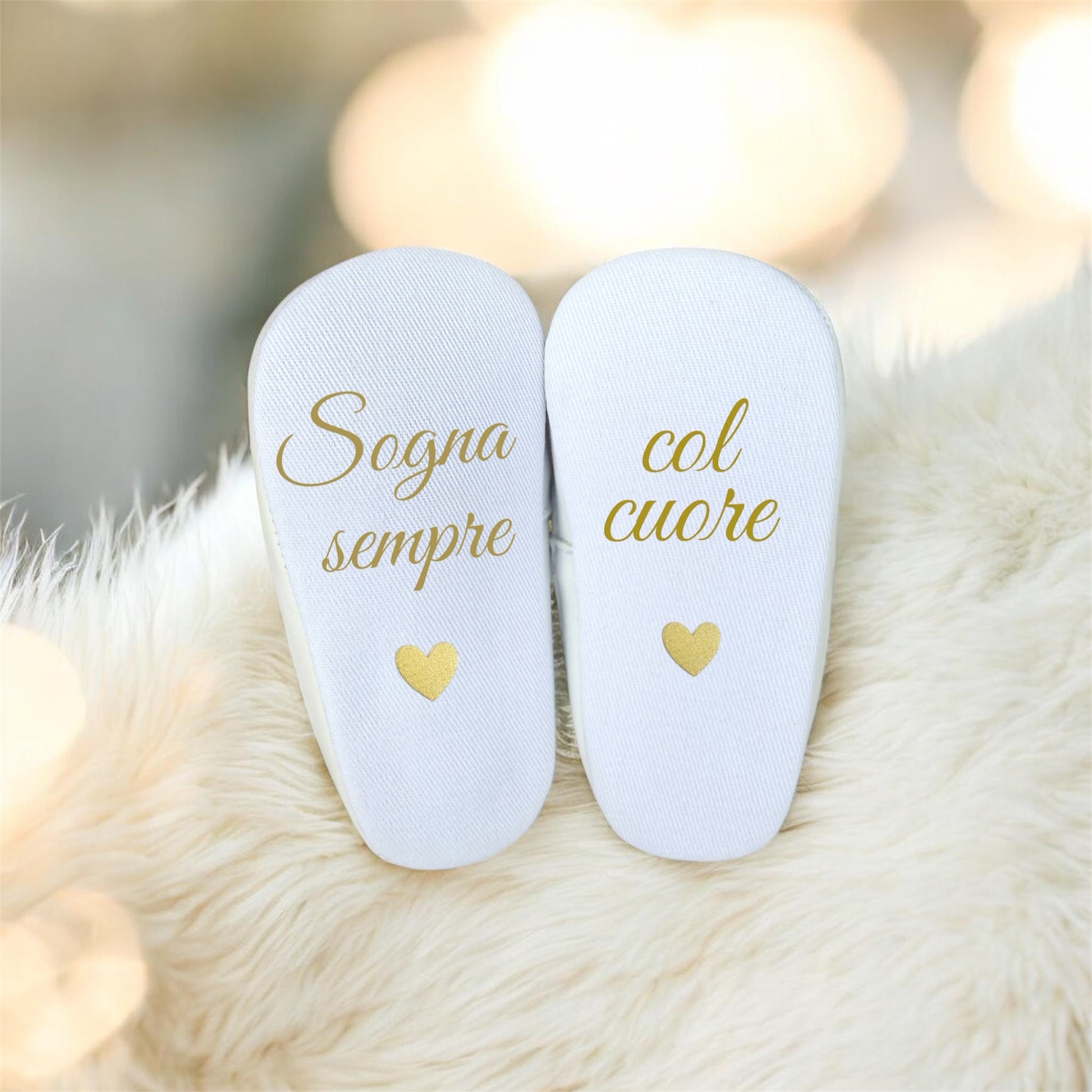 Ogni paio può essere arricchito con il nome del tuo bebè sui lati e una dedica speciale sotto la suola, scelta da te, per trasformare queste scarpine in un ricordo indimenticabile che accompagnerà il tuo piccolo in ogni primo passo.
